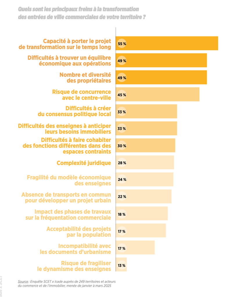 C’est là que ça coince – Transformation de longue haleine, équilibre économique… Les professionnels identifient une série de freins majeurs à la requalification des entrées de ville commerciales, comme le montre le diagramme ci-dessous.