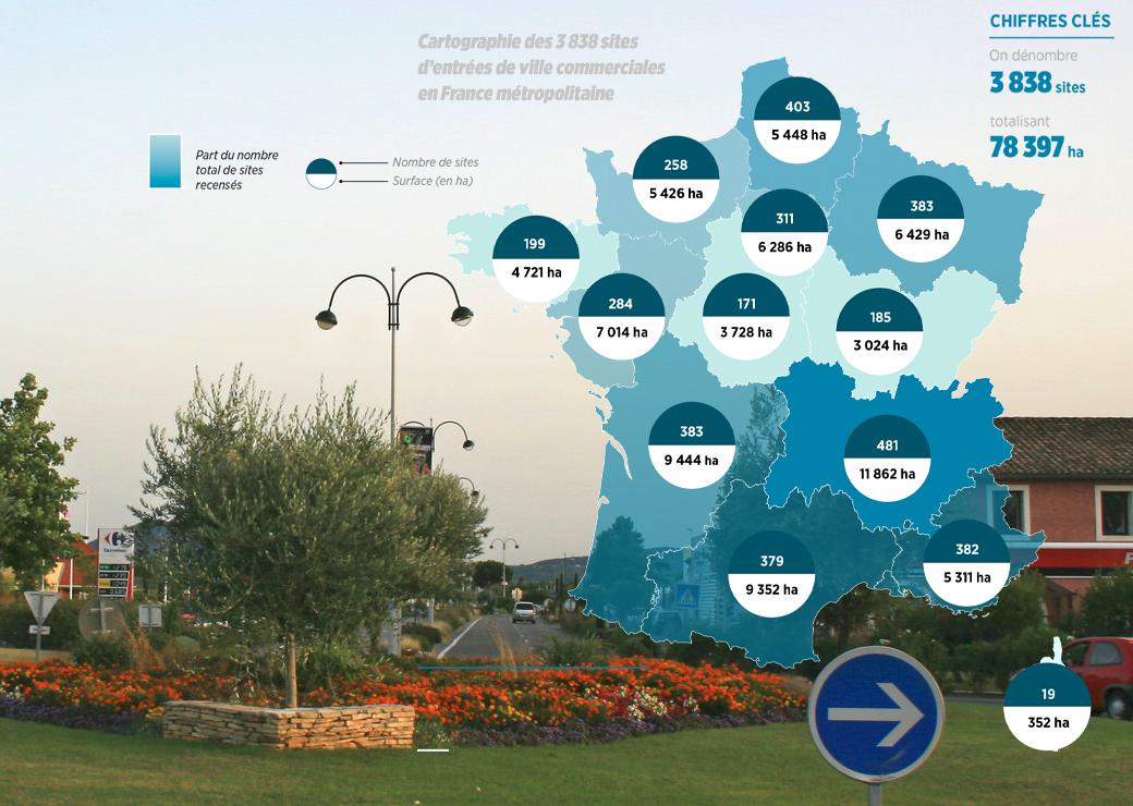 Le rapport recense plus de 3 800 sites commerciaux, répartis sur près de 80 000 hectares. Fait marquant : 83 % de cette surface se situe sur des sites de plus de 15 hectares, souvent devenus de véritables polarités économiques – mais aussi les plus complexes à transformer.