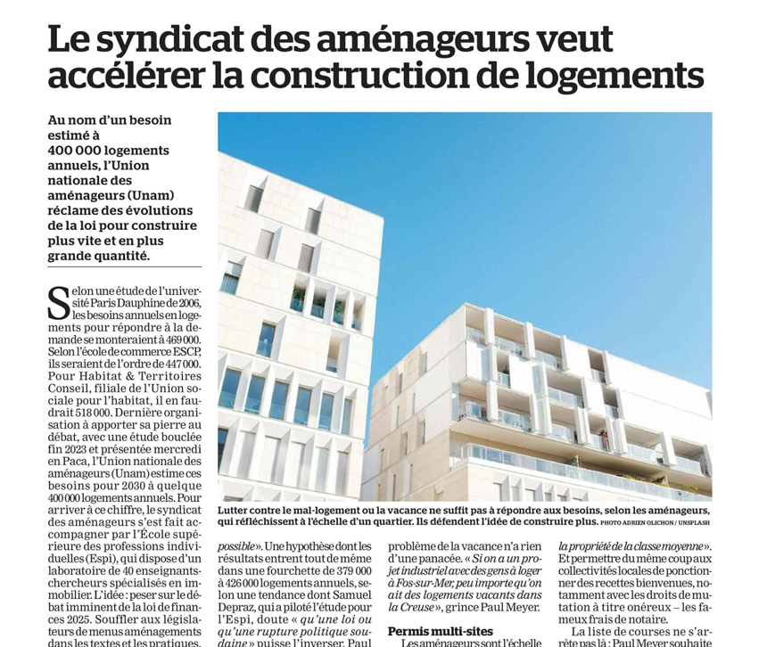 Au nom d’un besoin estimé à 400 000 logements annuels, l’Union nationale des aménageurs (Unam) réclame des évolutions de la loi pour construire plus vite et en plus grande quantité.